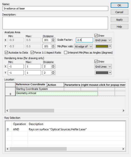 Recall that Irradiance at laser source was "attached" to the source using the drag-and-drop method after it was created as demonstrated in Figure 1-7 of the Basic section. "Attaching" an Analysis Surface means that the Analysis Surface is put in the coordinate system of an entity (in this case, the source) and has a Ray Selection filter (in this case "Rays on Optical Source.HeNe laser") other than its default "All rays". By virtue of its attachment, the Analysis Surface Irradiance at laser source moves with the source when the source was shifted as indicated above in Figure 2-6. The object now will be to simply move the Analysis Surface Irradiance at laser source to the desired location either by applying a Shift operation or, in this case, by changing its Reference Coordinate System to the Afocal subassembly. Either method will cause the Analysis Surface to physically move to the origin of the Afocal subassembly. To ensure that the beam is entirely contained within its area, open the Analysis Surface dialog and change the Scale factor from 1.5 to 2.5. Note that the Ray Selection remains unchanged; namely, "Rays on Optical Source.HeNe laser". The Analysis Surface dialog with these changes is shown in Figure 2-8.
