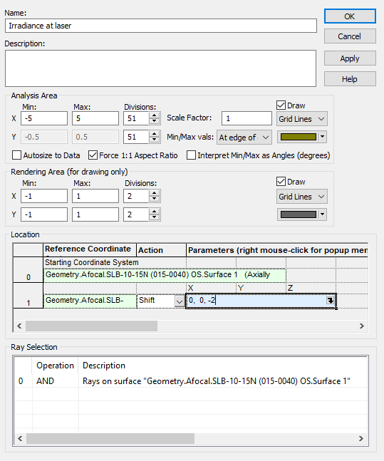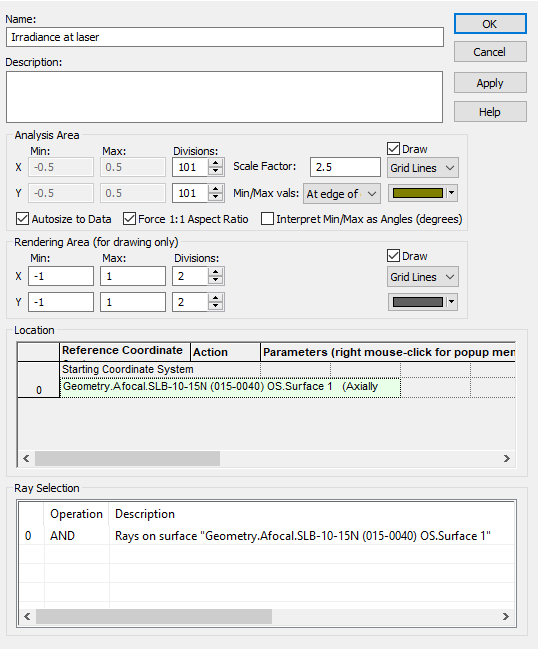 Figure 2-11. Analysis Surface Irradiance at laser source dialog after drag-and-drop.