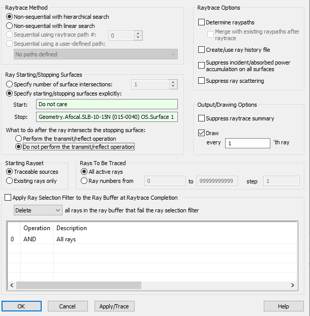 To perform this partial trace, set up the Advanced Raytrace dialog as shown in Figure 2-12 noting that under Ray Starting/Stopping Surfaces, the Stop surface has been designated as "Geometry.Afocal.SLB-10-15N (015-0040) OS.Surface 1" and the option Do not perform the transmit/reflect operation has been selected. Perform the trace by selecting the OK button.