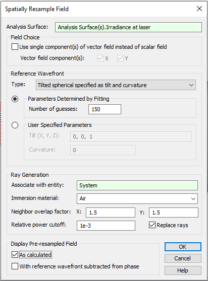 The next step will be to trace the source rays to the entrance surface of the afocal using the Advanced Raytrace dialog configured as in Figure 2-12. After the trace, open the Field Resampling dialog from the Main Menu Raytrace>Spatially Resample Field. First, select the Analysis Surface Irradiance at laser source which was configured appropriately above. Select the Reference Wavefront option Parameters Determined by Fitting leaving the default values of 150 for the Number of Guesses. Under the Ray Generation options, set the Relative power cutoff to 1e-03 and check both the As calculated and With reference wavefront subtracted from phase boxes under Display Pre-resampled Field. The Field Resampling dialog with these settings is shown in Figure 2-18.