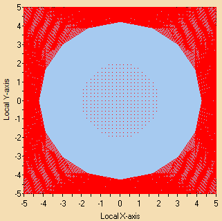 Let us now examine the individual beamlets at the same location using the Gaussian Ray Size Spot Diagram. This feature can be invoked directly after either of the two above approaches. Figure 2-13a shows the resulting Gaussian Ray Size Spot Diagram plot. Note that the beamlets overfill the Analysis Surface area. Open the Analysis Surface dialog box and reset the Scale factor to 5 and re-calculate. Now the area is large enough to encompass all of the beamlets as shown in Figure 2-13b. Note that editing the Analysis Surface does not require re-creating or re-tracing of the rays.