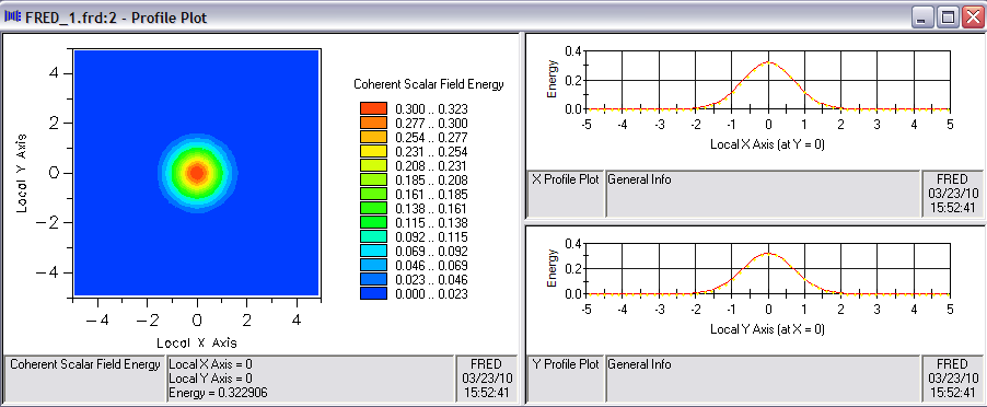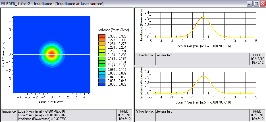 The rays now exist at the source location 5 meters to the left of the afocal and the Analysis Surface is positioned at the afocal. When an irradiance calculation is requested using Analysis Surface Irradiance at laser source, FRED does a free-space propagation by projecting the rays (including their secondaries) along their trajectories from their starting positions to the plane of the Analysis Surface. Note that this technique is only valid for free-space propagation. The resulting irradiance plot is shown in Figure 2-9. A close examination of the irradiance profile will show that the beam radius is, in fact, √2 larger than its initial 1 mm waist radius as shown in Figure 1-9. The on-axis irradiance has dropped by a factor of two, also as predicted by elementary Gaussian beam theory.