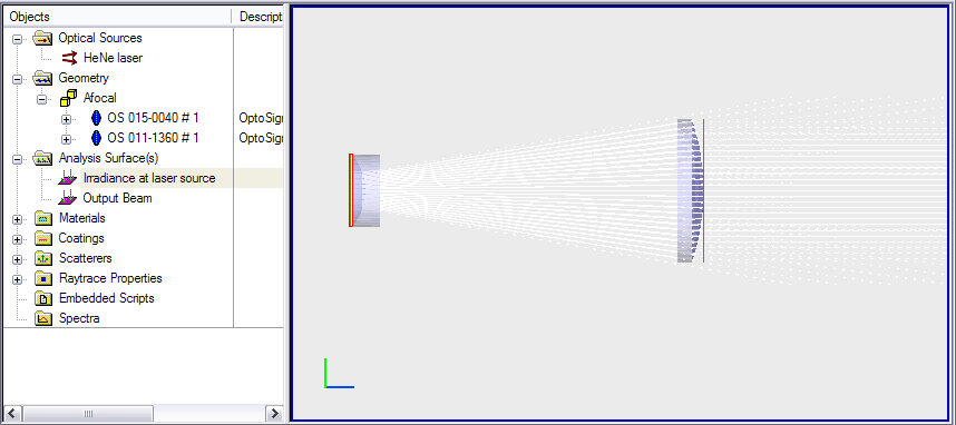 If the source is now traced using Trace and Render as shown in Figure 2-7, the rays enter the afocal with exactly the same trajectories as when the source was located just left of the input lens. At first, this may seem counter-intuitive since it is a well-known fact that Gaussian beams diverge and, from elementary Gaussian beam theory we know that ωRayliegh= √2ω0. The beam should be 1.414 times bigger entering the afocal. The expectation might well be that the ray bundle should have expanded in cross section. However, this is not the case. The base rays for the "Laser Beam" source type form a collimated grid. As a result, their trajectories remain unchanged regardless of how far the source is located from the first afocal lens. Divergence of the "Laser Beam" source is due entirely to the secondary rays associated with each base ray. Unfortunately, the secondary rays cannot be visualized directly. Their effect can only be "seen" by calculating the irradiance at the afocal entrance or by using the Gaussian Ray Size Spot Diagram. The remainder of this section is dedicated to examining the source with these tools.