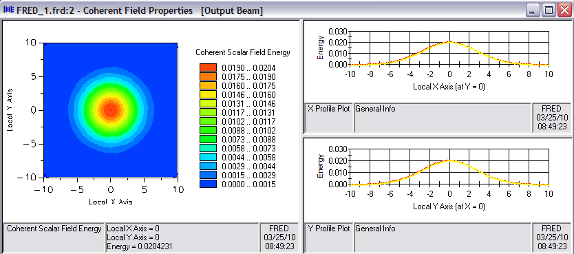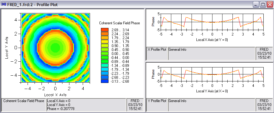 When the OK button is pressed, several things occur in series. FRED first calculates the scalar field in the plane of the designated Analysis Surface and will display the result in the Chart Viewer as directed by the Display Pre-resampled Field setting. Next, the existing rays are deleted and replaced by the new rays. The new rays have been created and are waiting to be traced. Figure 2-19 shows the Coherent Scalar Field Energy calculated from the initial rayset. Note that the Energy profile is of negligible amplitude outside of a circle of radius 2mm. It is recommended that the phase of this field be examined to ensure a smooth profile with no ambiguities or discontinuities. Right-click in the left portion of the Chart and select the option Show Field Phase. Figure 2-20 shows the corresponding Phase profile. Discontinuities are noted in the phase profile but these occur beyond the radius for which the energy drops to negligible values. A smooth phase profile is observed across the central portion of the beam.