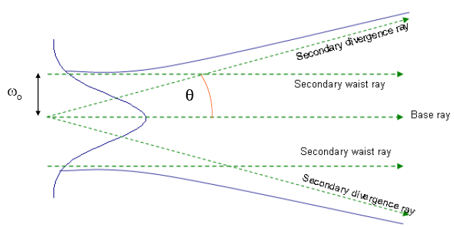 Recall from the Basic Tutorial that coherent sources consist of individual Gaussian beamlets. These beamlets are realized by tracing additional rays along with each ray in the grid. These additional rays are called "secondary rays" and are illustrated in Figure 2-1. Their genesis comes from the concept of Complex Raytracing introduced by Arnaud[1]. Each ray associated with the source grid is termed a "base" ray. There are four pairs of secondary rays termed "waist" and "divergence" rays. The "waist" ray is traced parallel to the base ray at a distance equal to the Gaussian beamlet radius ωo. The "divergence" ray begins at the position of the base ray and is traced at an angle θ defined by the Gaussian beam far-field divergence equation tan(θ)=λ/πωo where λ is the wavelength. Mathematical relationships between the base ray and its secondary rays allow the size and wavefront curvature of the beamlet to be computed at any point along the base ray trajectory. FRED keeps track of these secondary rays throughout the journey of each ray but does not draw them during the raytrace even when rays are traced using Trace and Render.