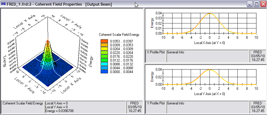 This leaves one final step; calculating the beam profile at the afocal output. Instead of using the Irradiance feature, try the Scalar Field feature with the Analysis Surface Output Beam. Recall that a Scalar Field calculation also provides access to a Wavefront profile by right-clicking in the Chart. Figures 2-22 and 2-23 show the Energy and Wavefront profile, respectively.