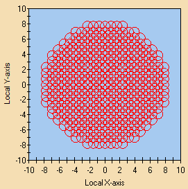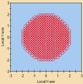 To illustrate its functionality, return to the document created in the Basic Tutorial. Use the function Raytrace>Create All Sources to generate the source rays at the source position. Invoke the Gaussian Ray Size Spot Diagram using the Analysis Surface Irradiance at laser source. Note as in Figure 2-1 the presence of overlapping circles centered on the individual rays in the grid. These circles represent the waist of each Gaussian beamlet. Recall that the size of the individual Gaussian beamlets is dictated by the spacing between rays in the grid. An additional multiplier of 1.5 termed the overlap factor is applied to the size of each beamlet for all coherent sources. This overlap factor ensures that the coherent summation of the individual beamlets produces a smooth amplitude profile. More information concerning these Gaussian beamlets can be found on the Help page Coherent Source Introduction and will be discussed in more detail later in this tutorial.