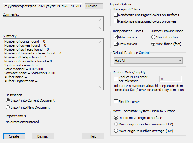 Initiate an import of CAD geometry and select the file "LS_T676_20141217_geometry.STEP". The CAD Import dialog should appear as shown in Figure 3-1. The Destination option should be set to Import into Current Document and the Surface Drawing Mode left in its default setting Wire frame (fast). Select the Create button to import the geometry. The Dismiss button must be pressed once the import is complete to close the dialog box. For further information concerning the options in this dialog, consult the Help manual under the topic CAD Import. The LED package will be imported as a subassembly with its local origin located at the Geometry coordinate system origin.