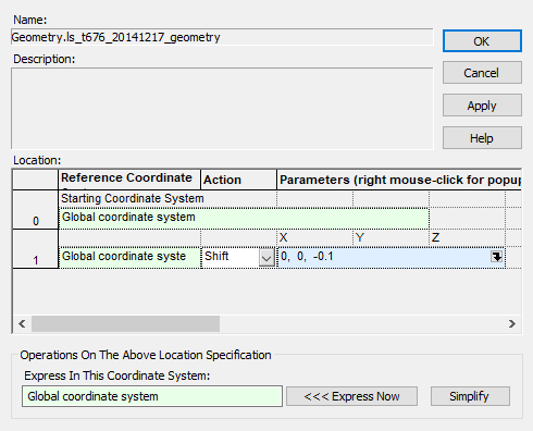 Right mouse click on the "Geometry.ls_t676_20141217_geometry" subassembly node and select the Position/Orientation option from the context menu. In the resulting position/orientation dialog, right mouse click on row 0 in the Location section and choose the "Append" option. Set the Z component of the new Shift operation type to -0.1 and then hit OK on the dialog. This shift, as shown in figure 3-2 below, has the effect of moving the CAD model of the LED geometry away from the origin by -0.1 mm.