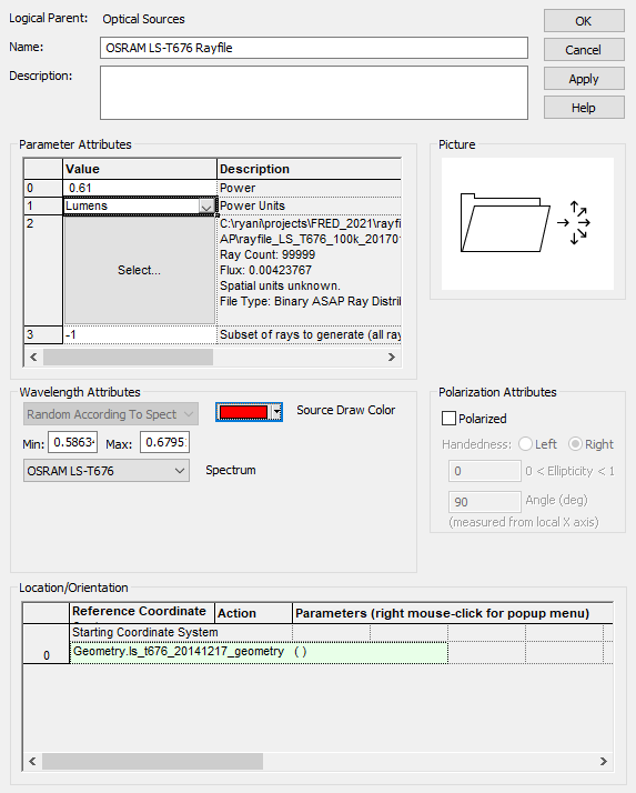 We will be representing the Super-Red variant of the LS-T676 package, which was previously set to emit 0.61 Lumens in the Intermediate tutorial. We will use the same power specification and spectrum for the rayfile source as was used in the previous tutorial sections.