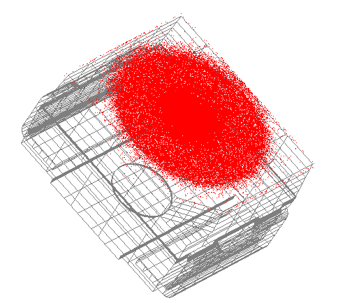Figure 3-5 shows the starting ray position distribution sitting just in front of the LED geometry. Although some number of rays can be seen in the 3D view to start from outside the nominal emitting aperture of the LED geometry, these rays will contribute negligible power to the total power of the source. These outlier rays are typical of rayfile data and their contributions to the resulting analyses will be inconsequential.