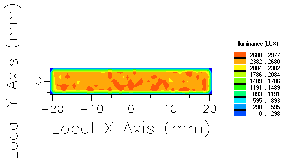 Figure 3-6 shows the resulting Illuminance distribution at the output of the Lightpipe, which is nearly identical the Illuminance calculated in the Intermediate section of this tutorial using the LED (far-field) source representation. Additionally, data printed to the Output Window as part of the Illuminance analysis indicates that the total integrated power in the Illuminance distribution is 0.52 Lumens.
