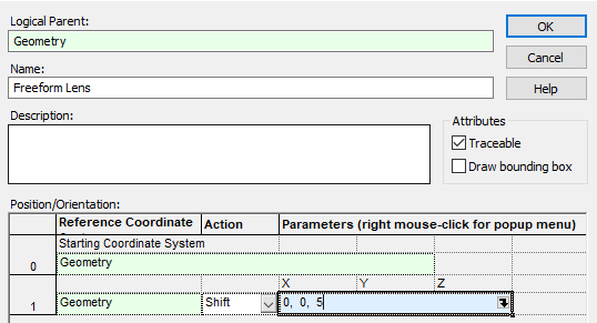 Name the element, "Freeform Lens" and shift the element by Z=5 mm the Global Coordinate System as shown in Figure 3-8.