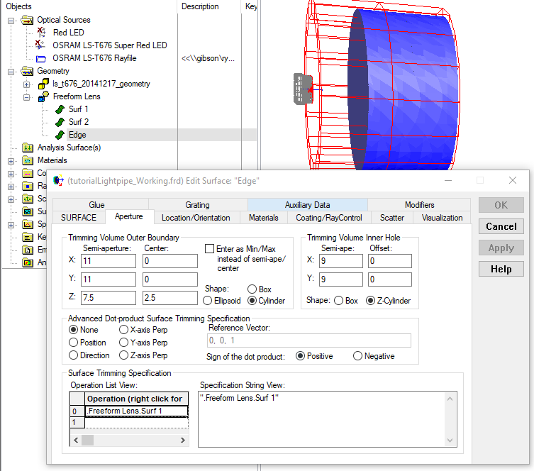 Next, we return to the Edge surface dialog trimming specification in order to remove the portion of the cylinder surface that lies to the right side of Surf 2 of the Freeform Lens. To accomplish this, we append on three more items to the trimming operation list view.