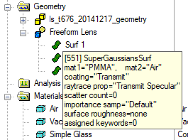 Confirm that the appropriate surface properties are assigned to each of the surfaces in the Freeform Lens custom element by hovering your mouse over the icon of each surface on the tree and inspecting the popup summary, as shown in Figure 3-14. The Edge surface should be left with the Absorb coating and Halt All raytrace property.