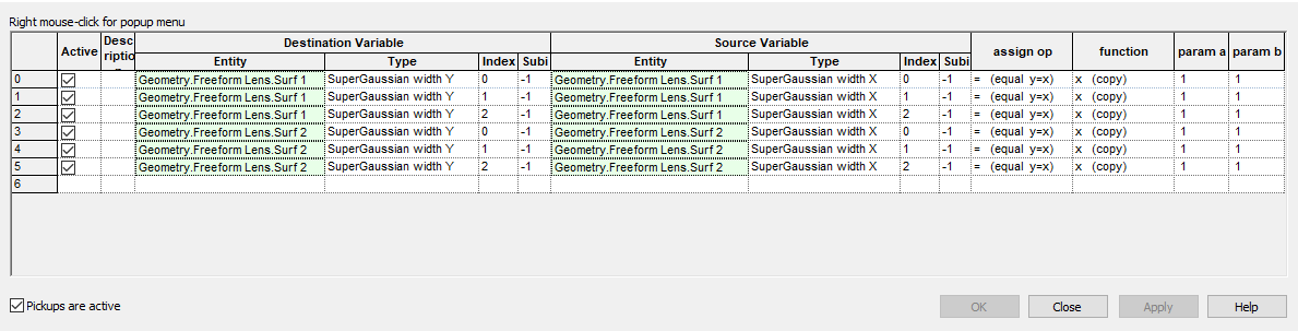 Open the Parameter Pickups interface by navigating to the menu item Optimize > Parameter Pickups. For the purpose of this example, it will be sufficient to configure only the columns underneath the Destination Variable and Source Variable headings. As an example, consider Figure 3-18 above. To access parameter Sx of Term #1 from Surf 1 of the Freeform Lens, we would use the Entity specification to select Surf 1, choose the Type specification to be "SuperGaussian width Y" and then set the Index specification to be 1 (corresponding to the Term #). The video in Figure 3-19 shows the procedure for specifying the Sx parameters of Surf 1 as the Source Variables and then specifying the Sy parameters of Surf 1 as Destination Variables.
