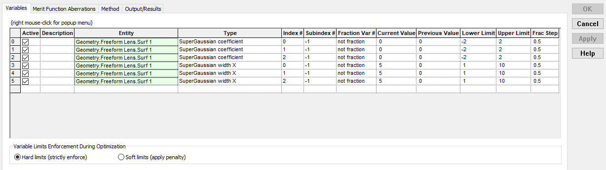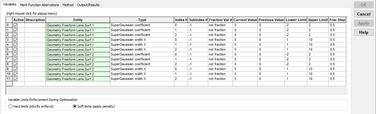1. Variables: This set of information indicates the parameters of the model that will be varied during optimization. In our application, the variables will be the amplitude coefficients and X semi-widths of the terms on the front and back SGS surfaces of the freeform lens.