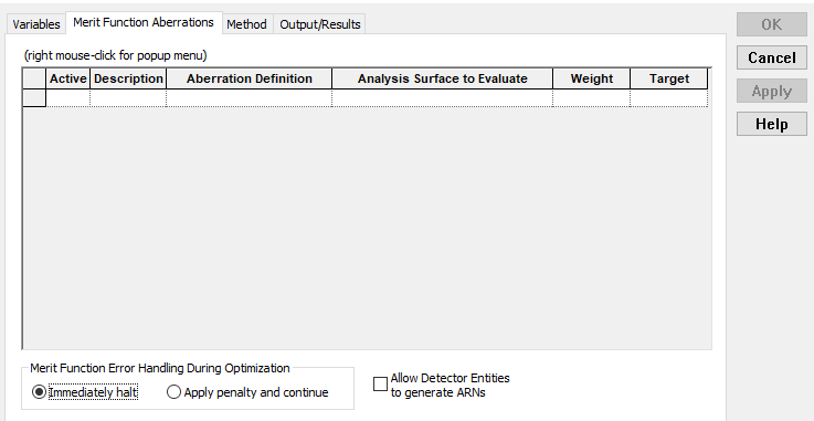 Figure 3-25. Initial appearance of the Merit Function Aberrations tab on the optimization dialog.