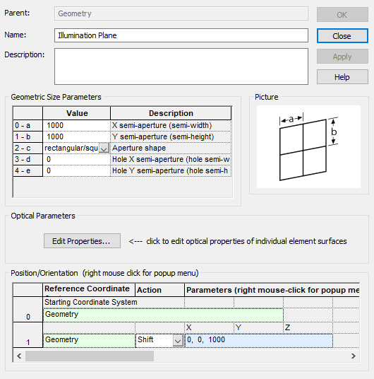Right mouse click on the Geometry folder and choose, Create Element Primitive > Plane. Give this plane the name, "Illumination Plane", set its X and Y semi-apertures to 1,000 mm, and shift the plane in Z by 1000 mm. The final dialog for the illumination plane is shown in Figure 3-16.