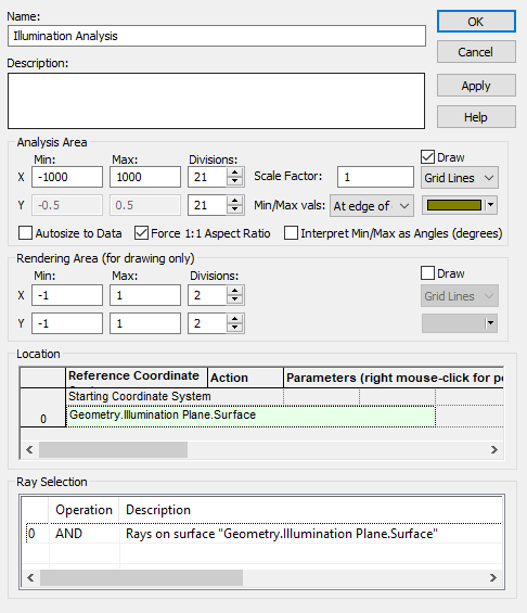 Next, right mouse click on the Analysis Surface(s) folder and select, New Analysis Surface. In the resulting dialog, name the analysis surface "Illumination Analysis", set the aperture limits to go from -1000 to +1000 mm, set the location to be at Geometry.Illumination Plane.Surface, and set the ray selection filter to isolate only "Rays on surface Geometry.Illumination Plane.Surface". The configured analysis surface dialog is shown in Figure 3-17.