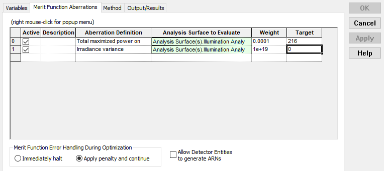 2. Aberrations: A merit function will be formed during optimization and used to determine whether the optimization process is moving the variables in the direction of the best configuration. The merit function itself is formed by defining individual aberrations to be evaluated (ex. RMS spot size, total power, irradiance variance) and then taking the weighted sum of the squares of the aberrations as the final merit function value. In our application, the aberrations will be configured to maximize the total power on the illumination plane and to minimize the variance in the irradiance distribution at the illumination plane.