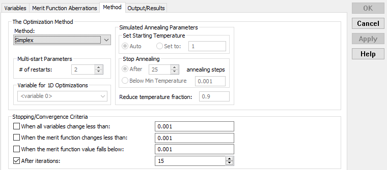 To complete the optimization configuration, move to the Method tab. The default settings of the Method tab are shown below in Figure 3-28, which are sufficient for the purposes of this example. Note that the optimization method being used is the Simplex option and that the optimization will run for 15 iterations.