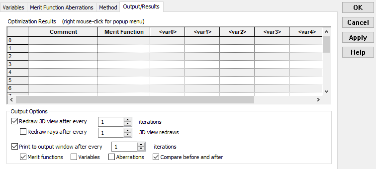 The Output/Results tab, shown below in Figure 3-29, contains options for redrawing the 3D view during optimization iterations and reporting information about the merit function and aberrations to the output window. The spreadsheet at the top of the dialog will store up to the last 20 optimization results, with right mouse click context menu options available to organize the stored results, apply them to the FRED document, or apply them to the Variables tab of the optimization dialog. The default settings on this tab of the optimization configuration are sufficient for the purposes of this example.