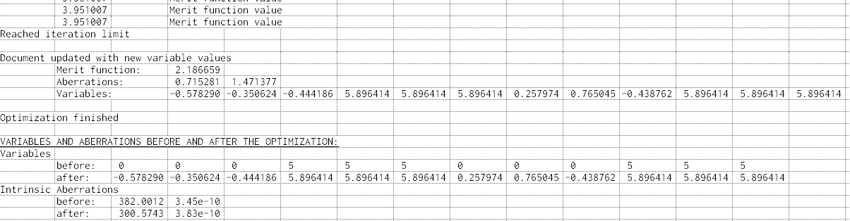 During optimization, the value of the merit function for each iteration of the Simplex is reported to the output window. Optimization will stop once 15 iterations of the Simplex have been evaluated and the final merit function, aberrations, and variable values will be printed to the output window, as shown in Figure 3-31. Additionally, a summary comparison of the variables and aberrations before and after optimization is printed to the output window.