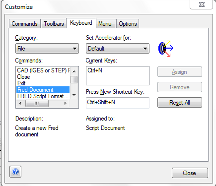 The Keyboard tab of the Customize dialog allows remapping of the accelerator keystrokes (keyboard combinations that call specific functions). The list of commands available for use with accelerator keystrokes is found in the Commands list and the Category list can be used to filter the Commands list. When a command is selected, the Current Keys box will display the existing accelerator keystroke (if applicable). An existing accelerator keystroke can be removed by selecting the keystroke from the Current Keys list and then hitting the Remove button. A new accelerator keystroke can be defined by clicking in the "Press New Shortcut Key" box and then typing the desired keystroke on your keyboard. If the desired keystroke is already in use by another command, that will be indicated by the "Assigned to" text. If the keystroke is not already assigned, the Assign button will become active and you can press it to assign the keystroke to the selected Command.