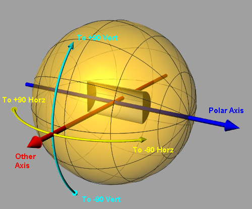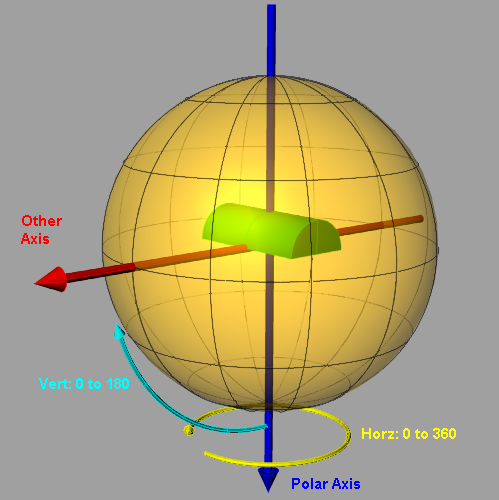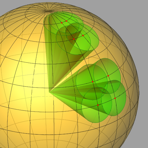 Note that for adjacent polar directions near the equator the overlap is much smaller than for the same size cones near the pole. The net effect is that adjacent intensities near the poles will vary less than those near the equator. The cone half-angle can be set so that some adjacent directions do not overlap, as illustrated below.