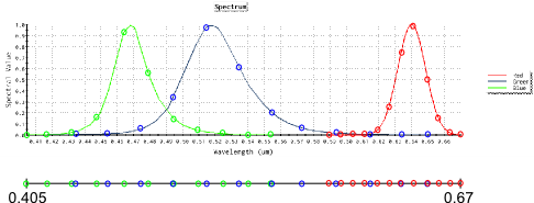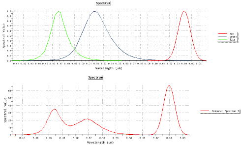 Non-uniform Wavelength Distributions Consider the following scenario; three LED's (R, G and B) are combined to provide white light illumination. This is modeled in FRED by creating three sources, each with the appropriate R, G, B spectrum and power weighting. The sources are set to generate wavelengths randomly according to a spectrum, using the individual R, G, B spectra shown on the top of the graphic below. If we create these sources (resulting in several millions of rays) and perform a spectral analysis on the resulting rayset, we get the spectrum shown on the bottom of the graphic below. This combined spectrum contains several millions of unique wavelengths by virtue of having used the "Randomly according to spectrum" wavelength generation method. Consequently, the spectral analysis mode would use the fixed bin calculation mode because we have exceeded the maximum wavelength count of 200.