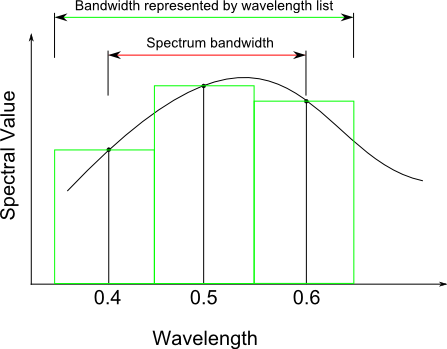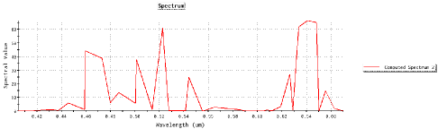 How did changing the wavelength generation mechanism on our sources lead to the spectrum shown above? The maximum wavelength sample count value in our Spectral Analysis is set to 200 samples and our sources only generated a total of 36 unique wavelengths (12 wavelengths each). So, our spectral analysis is binning the rays using the discrete sampling mode. In the discrete binning mode, the distance between adjacent samples defines the bin size for a given sample point. Although each source sampled its own spectrum using evenly spaced samples, the resulting composite spectrum shows sample points which are very non-uniform, as shown below.