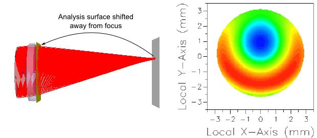 The OPD map cannot be computed at the focus of an optical system. In this case the analysis surface must be moved away from focus and the best fit sphere will be centered on the focus position, as shown in the layout below.