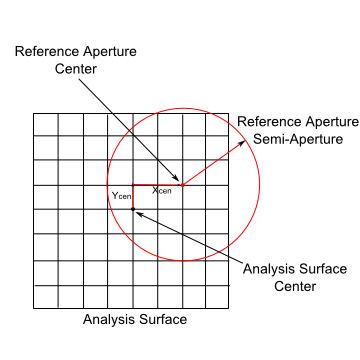 Given an analysis surface being used in the OPD Map calculation, a virtual reference aperture is specified such that rays outside of its semi-aperture are excluded from the reference sphere fitting and OPD map calculations. The reference aperture specification is shown below relative to the designated analysis surface being used in the OPD Map calculation.