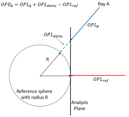This analysis calculates an Optical Path Difference (OPD) map based upon geometric ray data and is used to evaluate the quality of the wavefront carried by a collection of rays. One OPD map will be generated for each unique wavelength in the rayset (up to 20 different wavelengths are supported). Determination of the OPD for each ray is made using the ray's optical path length (OPL), a reference sphere centered on the best focus position, and the OPL of a reference ray. In the image below, the reference sphere represents the ideal wavefront converging as a spherical wave onto the focus point. Of the rays at the analysis surface being used in the OPD calculation, the ray closest to the center of of the aperture will be treated as the "reference ray". The OPD for all rays is calculated with respect to the OPL of the reference ray. With the reference sphere and the reference ray determined, the OPD of any ray is then calculated by finding the total path length of the ray when it intersects the reference sphere (OPLA + OPLdelta in the image below) and then subtracting off the OPL of the reference ray.
