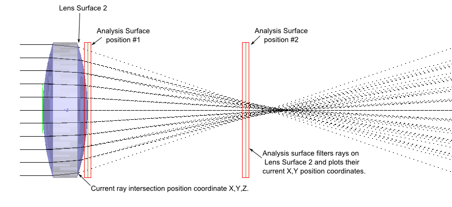The positions of the rays included in the spot diagram are the X and Y coordinates of each ray on the surface with which they are currently associated. For example, consider the singlet system shown below in which an analysis surface is filtering rays on the back surface of a lens element. A positions spot diagram analysis at either position #1 or position #2 would show the same result, though the free space propagation clearly shows that the beam footprint should be smaller near the lens focus. The reason for this is that the rays being included in the result are associated with Lens Surface 2, and so their X, Y position coordinates are fixed there in FRED's internal ray structure until they intersect another surface in a raytrace.