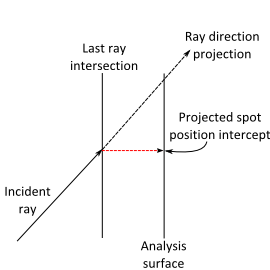 Spot diagram between two elements The simplest method for analyzing the beam footprint between two optical elements is to use an intermediate transmitting plane and analysis surface in conjunction with FRED's advanced raytrace utility. Consider the following layout in which the goal is to observe the beam footprint between the two lens elements. The intermediate plane is defined using materials Air/Air, a 100% transmitting coating, and a transmit specular raytrace control so that the rays are undeviated in the airspace between the two lens elements. The intermediate plane allows use of the advanced raytrace utility so that rays can be temporarily halted at that position for an analysis and then be continued on after the analysis is complete.