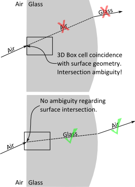 If the 3D box has been positioned such that any surfaces of its cells are coincident with the geometry, the potential exists for the 3D box to induce incorrect results in the raytrace. This situation will typically be observed as material error warnings in the output window after the raytrace has completed.