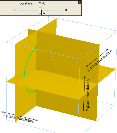 Visualization of the analysis results in the 3D view uses cutting planes which can be dynamically translated along their plane normals, allowing the quantity of interest to be displayed on the cutting planes anywhere within the volume. Once the analysis result has been displayed, any of the cutting planes can be activated for translation by double mouse clicking on the cutting plane of interest directly in the 3D viewer. This action puts the 3D viewer into a state which allows translation of the selected cutting plane and opens a slider bar dialog in the upper left corner of the visualization window. The cutting plane which was selected can be translated through the volume in the following ways: •Mouse wheel up/down •Keyboard up/down arrow •Keyboard page up/page down (steps 1/10 of volume width in the selected direction) •Explicit location set from the visualization view dialog (see below)