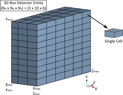 The 3D Box is a specialized type of detector entity which records the flow of power as it propagates through box's volume. The volume is composed of a number of 3D cells which allow the spatial distribution of power transfer between adjacent cells to be captured during the raytrace. In the diagram below, a 3D Box has been defined with 3 cells in X, 10 cells in Y and 6 cells in Z.