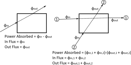 Per cell, the power absorbed is simply the power input into the cell less the power leaving the cell. Similarly, the flux into the cell (InFlux) is the summation of the power on all surfaces coming into the cell and the flux out of the cell (OutFlux) is the summation of the power on all surfaces leaving the cell. For the simple case shown above of a single ray passing through a single cell of the 3D box, there is total input flux of fin, total output flux of fout and the difference between the two results in the absorbed flux. As shown on the right in the image above, the calculation proceeds the same for the case where multiple rays are passing through a cell in the 3D box. In this case, we simply sum over all rays incident on the cell surfaces to get the InFlux value, sum over all rays leaving the cell surfaces to get the OutFlux value and the difference between the two is the AbsorbedFlux value.