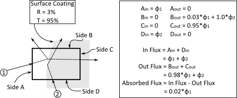 For the two input rays shown, only cell surfaces A and D have input flux and the resulting cell InFlux is therefore the summation of the input flux from these two surfaces. Only cell surfaces B and C have output flux and the resulting cell OutFlux is therefore the summation of the output flux from these two surfaces. The cell's absorbed flux is the difference between the InFlux and the OutFlux, which in this case leaves 2% of the power from ray #1 within the cell (ray #2 undergoes total internal reflection at the interface).