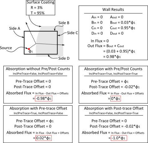 To illustrate these controls, consider an extension of the previous example where we have a source embedded within a single cell that also contains a coated surface interface. The coating property on the surface is defined such that R+T<1 and the raytrace property on the surface will leave behind an Absorbed Ray having flux 1-(R+T) upon interaction. The resulting AbsorbedFlux calculation for the four combinations of the InclPreTrace and InclPostTrace flags are provided below as a numerical example to help clarify their application.