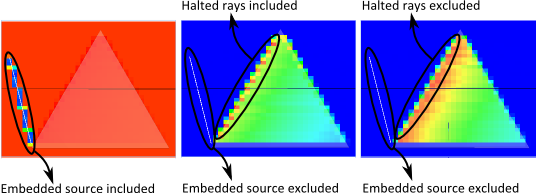 Embedded Sources How does having a source starting inside of a cell of the 3D Box affect the resulting calculation of AbsorbedFlux? If the source starts within a cell of the 3D Box, then its flux is not counted in the InFlux calculation (the rays never crossed the cell walls coming into the cell) but its flux is counted as the rays leave the cell. The net result is that the AbsorbedFlux value in the source's starting cell is negatively biased by the amount of the source's flux. If the user wants to remove the negative bias due to the source's starting flux, the InclPreTrace boolean can be set True. This has the effect of adding the source's flux as a positive offset in the AbsorbedFlux calculation.