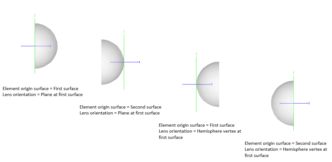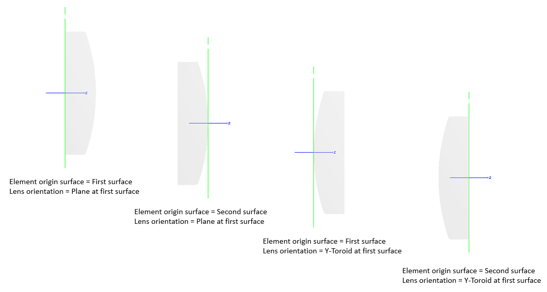 Four different configurations of the origin surface and orientation parameters for a cylinder lens element primitive are shown below.
