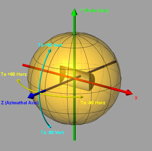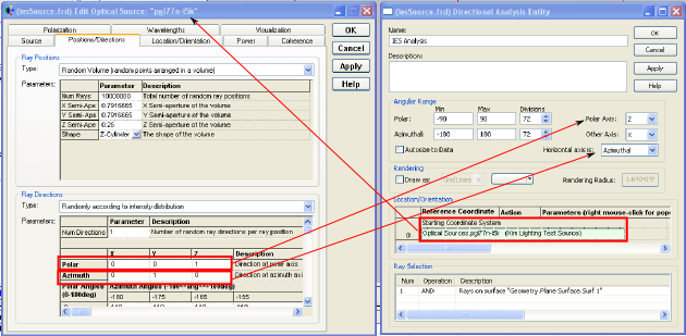 Step 3 - Create a DAE according to photometry type A directional analysis entity can be created with azimuthal and polar angles matching the source's photometry type. This can be useful for visualizing the source orientation and verifying the angular distribution. The source dialog can be used to select the proper polar and azimuthal axes definitions for the DAE. First, the DAE is placed in the coordinate system of the detailed optical source. Then, the polar axis is chosen according to the direction vector specified in the ray directions section of the source while the "other" axis of the DAE is chosen to be the remaining axis not specified by the azimuthal vector of the ray directions (see following image).