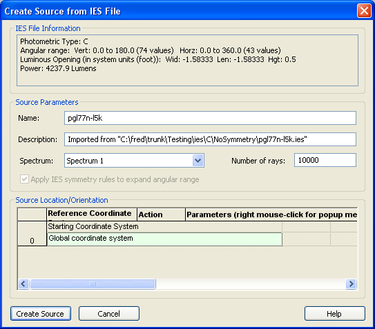 Step 2 - Create New Source from IES File Navigate to: Menu > Create > New Source from IES File. This source will use the file "pgl77n-lk5.ies" available from Kim Lighting. The import dialog indicates the following information about this IES file: Photometric Type: C Angular Range: 117 values over the full sphere Luminous Opening: Cylinder of length 0.5 and full aperture 1.58333. Power: 4237.9 Lumens
