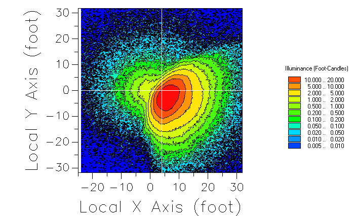 Step 5 - Trace and calculate ISO foot-candle plot With the proper orientation of the source and collection plane now set, the number of source rays was increased significantly to 1,000,000. With the source traced, the illuminance calculation was performed with units of foot-candles and the chart controls specified to use iso-contour lines. The resulting FRED illuminance calculation and the Kim Lighting measurements are shown below. Noise at angles where the intensity values are low is to be expected since fewer rays are generated in these directions.