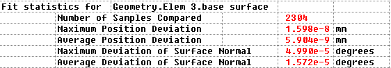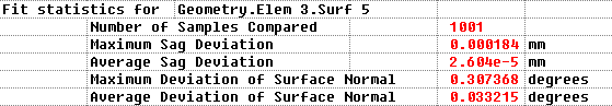 Export Accuracy and Verification As described in the previous tables, FRED uses fitting routines for several surfaces types because the FRED surfaces do not have exact NURB representations. In the cases of the standard aspheric, general aspheric, and the conic foci surfaces, FRED fits the radial profile to a user-specified number of sample points. By default, the fitting statistics are reported in the output window. The sample points are generated to the maximum radial dimension of the outer trimming volume. If the surface is subsequently trimmed, the printed statistics may not be accurate. FRED output fitting statistics for a standard aspheric surface is shown in the following image.