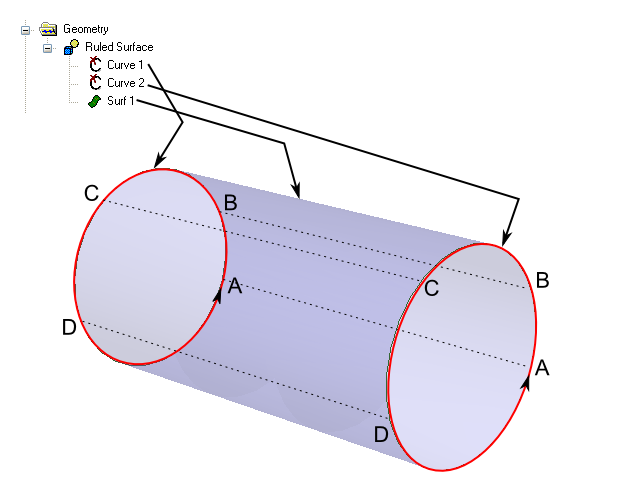 Each sampling specification has an important impact on the accuracy of the exported surface as represented by NURBs. Take the case of the cylinder shown in the following figure which was created in FRED as a ruled surface.